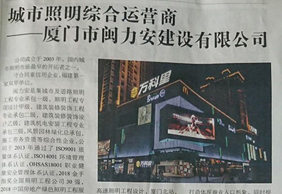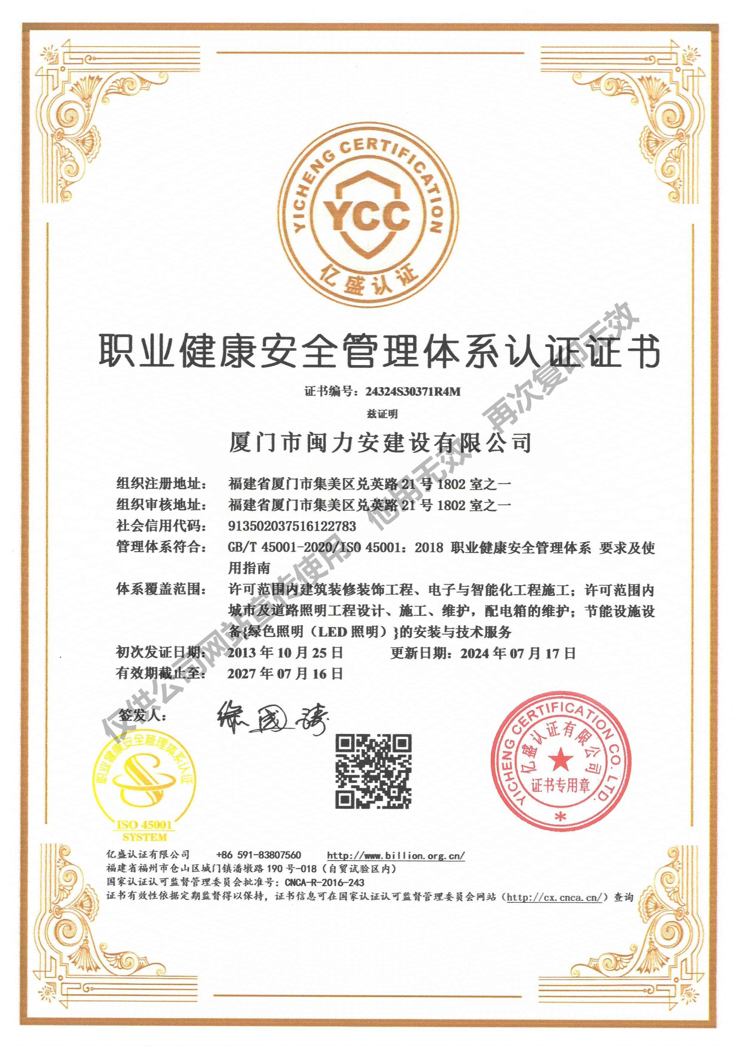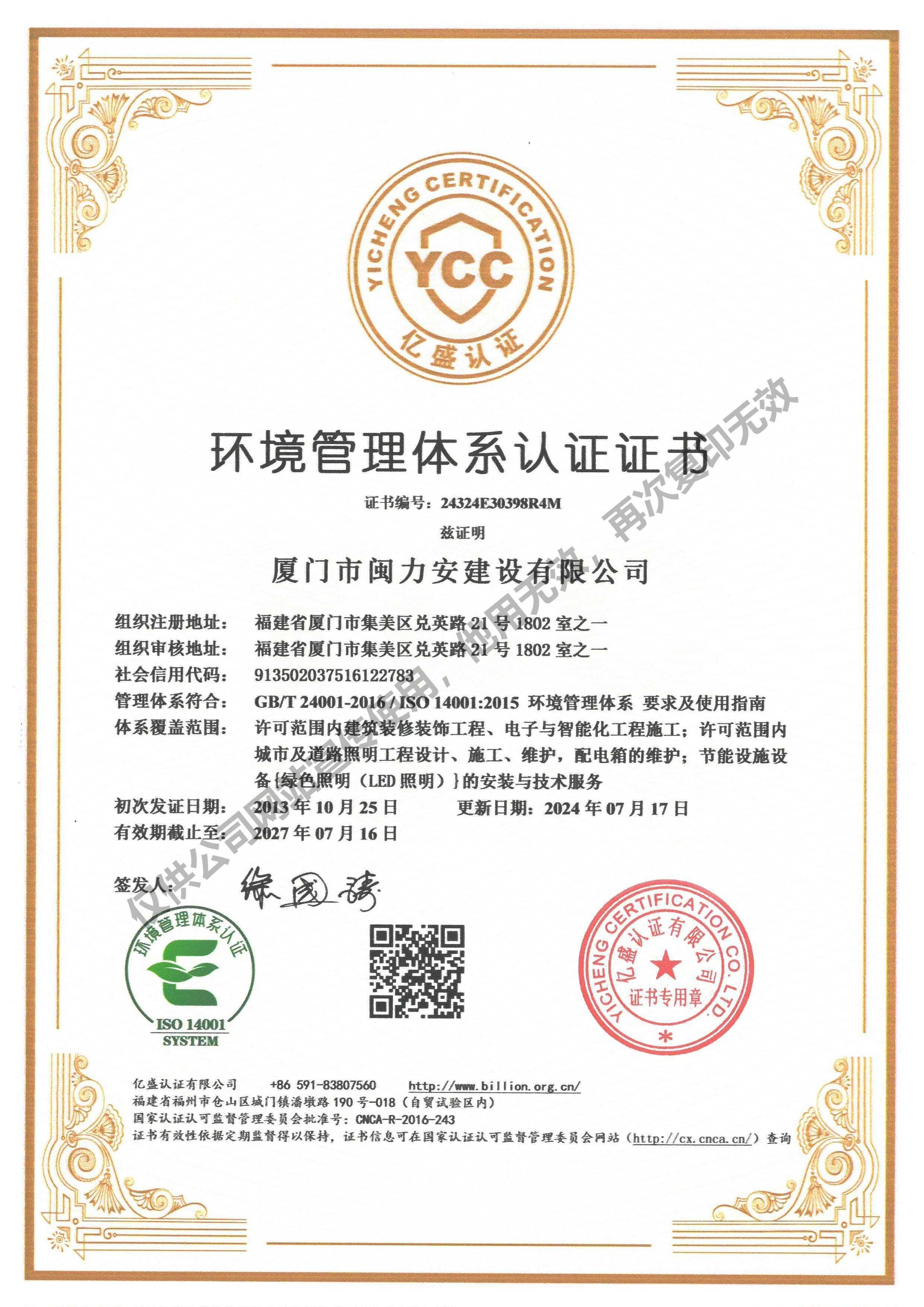 廈門(mén)市閩力安建設(shè)有限公司成立于2003年,公司取得市政公用工程施工總承包貳級(jí)、建筑裝修裝飾工程專(zhuān)業(yè)承包壹級(jí)、城市及道路照明工程專(zhuān)業(yè)承包壹級(jí)、電子與智能化工程專(zhuān)業(yè)承包貳級(jí)、消防設(shè)施工程專(zhuān)業(yè)承包貳級(jí)、電力工程施工總承包叁級(jí)、建筑機(jī)電安裝工程專(zhuān)業(yè)承包叁級(jí)、輸變電工程專(zhuān)業(yè)承包叁級(jí)、環(huán)保工程專(zhuān)業(yè)承包叁級(jí)、照明工程設(shè)計(jì)專(zhuān)項(xiàng)甲級(jí)、建筑裝飾工程設(shè)計(jì)乙級(jí)、施工勞務(wù)等資質(zhì)的綜合型企業(yè),公司于2013年通過(guò)了ISO9001質(zhì)量體系認(rèn)證,ISO14001環(huán)境管理體系認(rèn)證,OHSAS18001職業(yè)健康安全管理體系認(rèn)證。